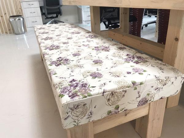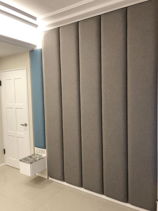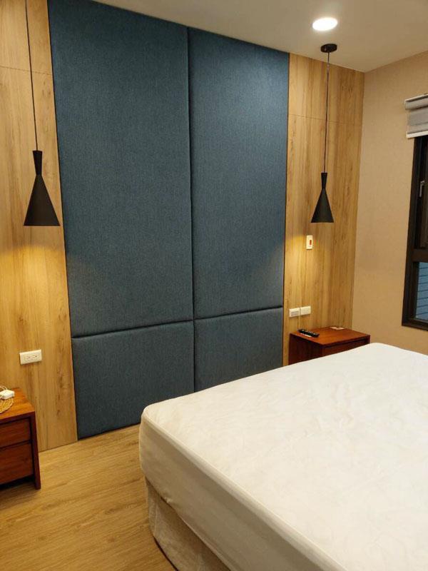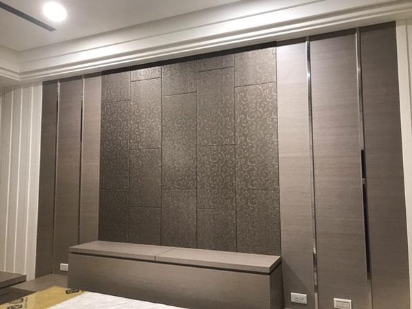 大面積使用壁面繃布增加空間的輕盈感,並多出一份恬靜優雅的氛圍。繃布顏色、材質或是質感選擇性非常多,可以依照家中色調去作搭配,撞色或同色調都可以提升空間的精緻度。使用皮革質感的繃布,可彰顯主題牆面的尊貴感,成為臥室中的視覺端景,同時增加空間的安定感。